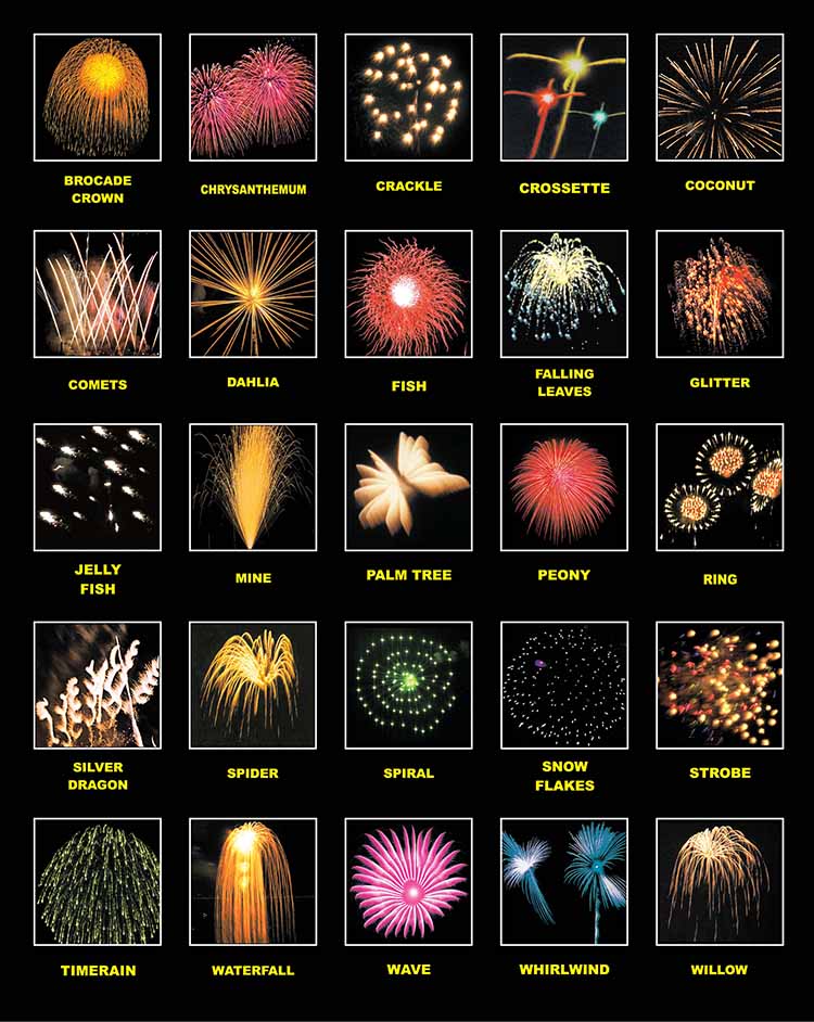 The Phantom Fireworks website’s glossary and chemistry compounds page are bursting with more information about the different shapes, sizes, colors, and effects of fireworks. There are also several other firework glossaries to check out, along with this retro PBS site for a closer look at the anatomy of a firework.