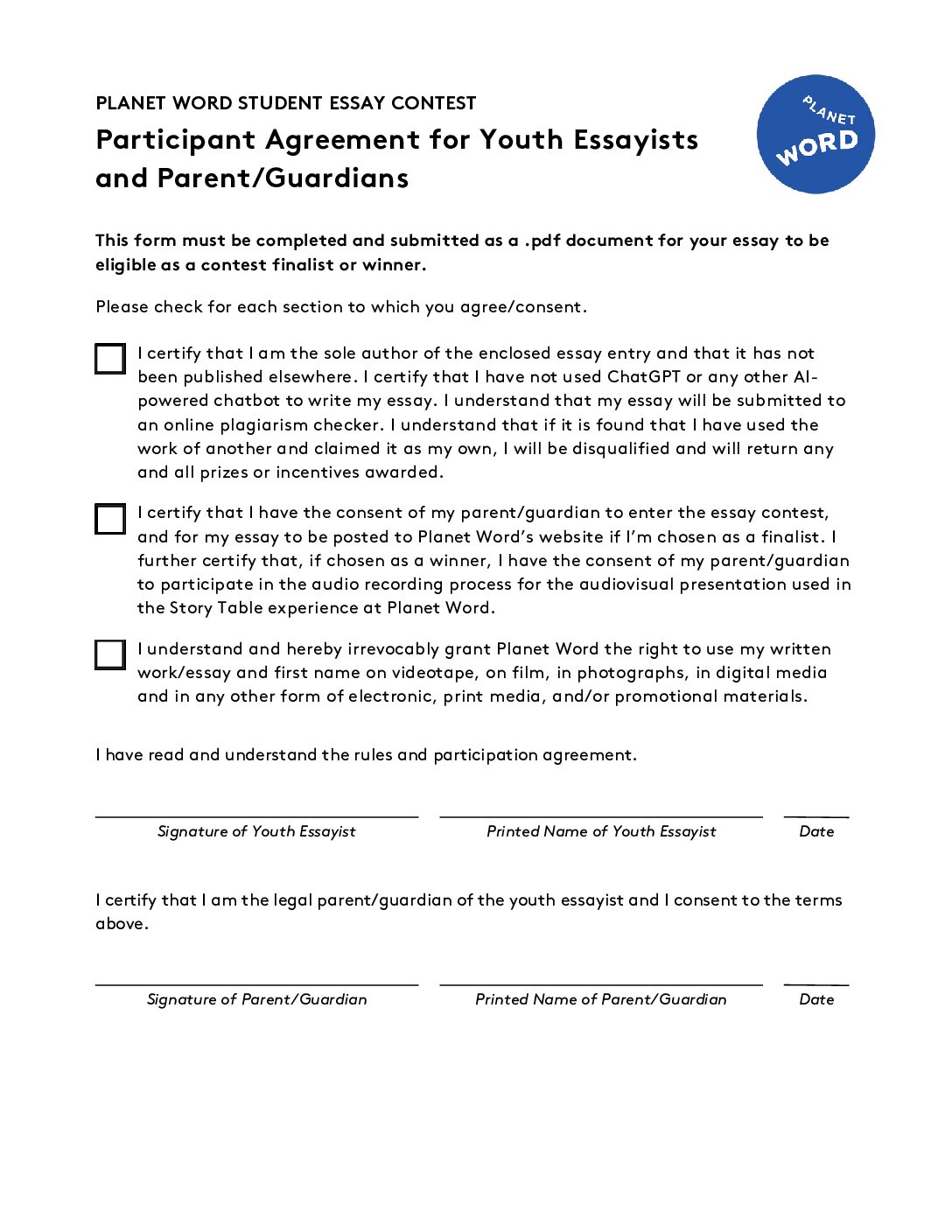 - Participants must submit their essay through the form on Planet Word’s website.